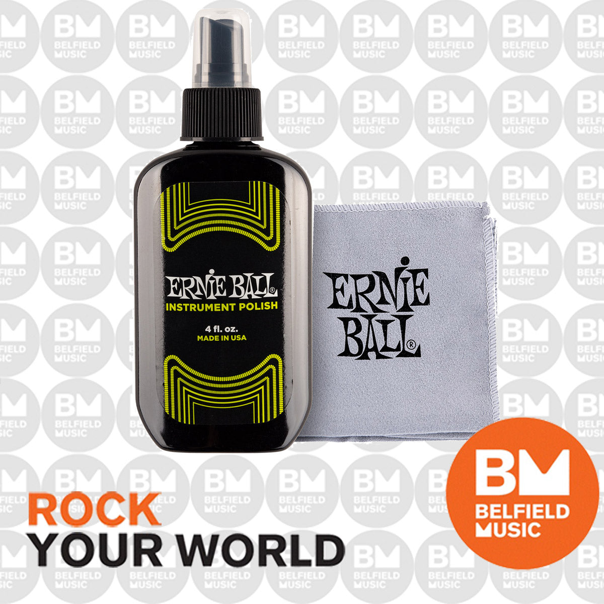 Ernie ball Guitar Polish Cloth and Polish Ernie Ball's proprietary polish formula is oil-free and won't leave a powdery residue on your instrument. Spray on the cloth and wipe off in a circular motion for a streak-free shine. Safe on most woods and finishes. Contains silicone. Comes with 12 x 12-inch grey Microfiber polish cloth with stitched edging. Washable.