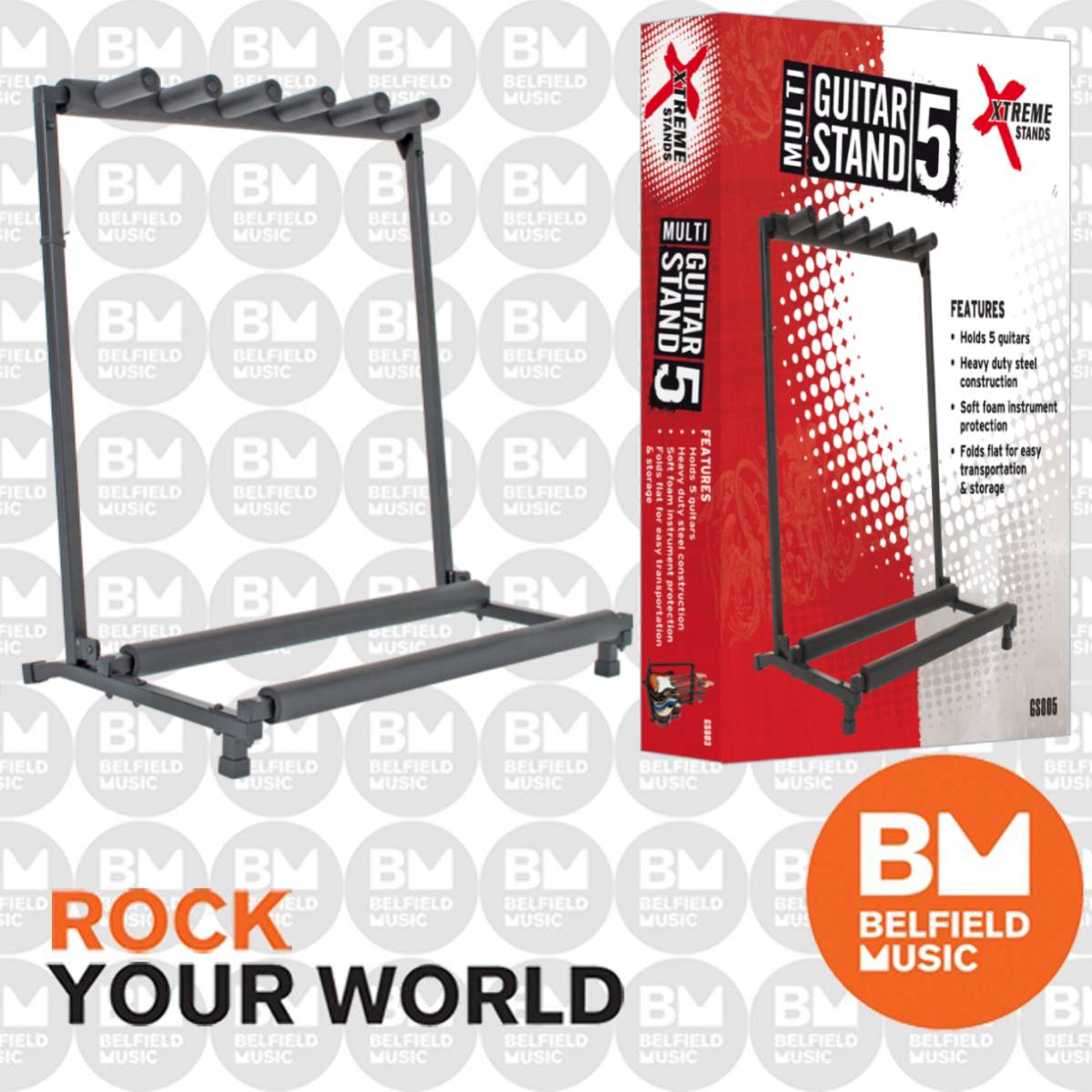 This Multi Guitar Stand is designed to securely hold up to five guitars—acoustic, electric, or a combination of both. Built with a heavy-duty square section tubular steel frame, it offers reliable strength and stability for studio, stage, or home use. Extra thick EVA foam rubber padding protects the necks and bodies of your instruments from scratches and dings. The stand folds up easily for compact transport and storage.