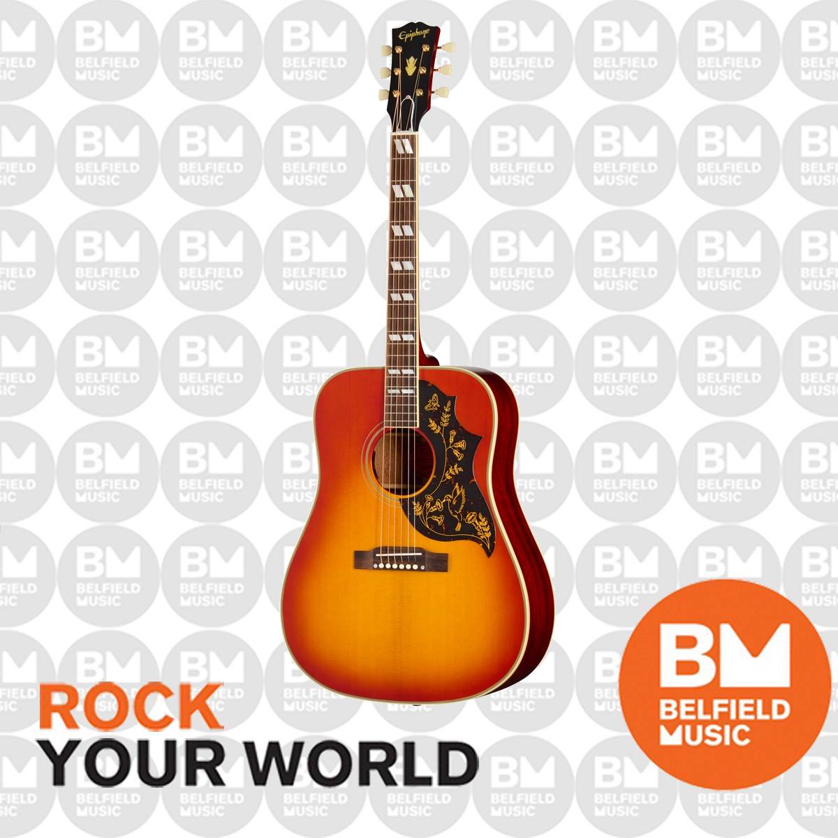 The pickguard features the legendary Hummingbird shape and engraved artwork design. On the headstock, gold-plated Epiphone Deluxe tuners with green Keystone buttons help ensure solid tuning stability so you can spend more time playing and less time looking at an electronic tuner. The headstock features a two-ply black and white truss rod cover, and the Epiphone logo and Gibson Crown are inlaid in aged mother-of-pearl. The headstock features a Gibson-style “open book” profile with the Inspired by Gibson Custom double diamond logo etched on the rear.