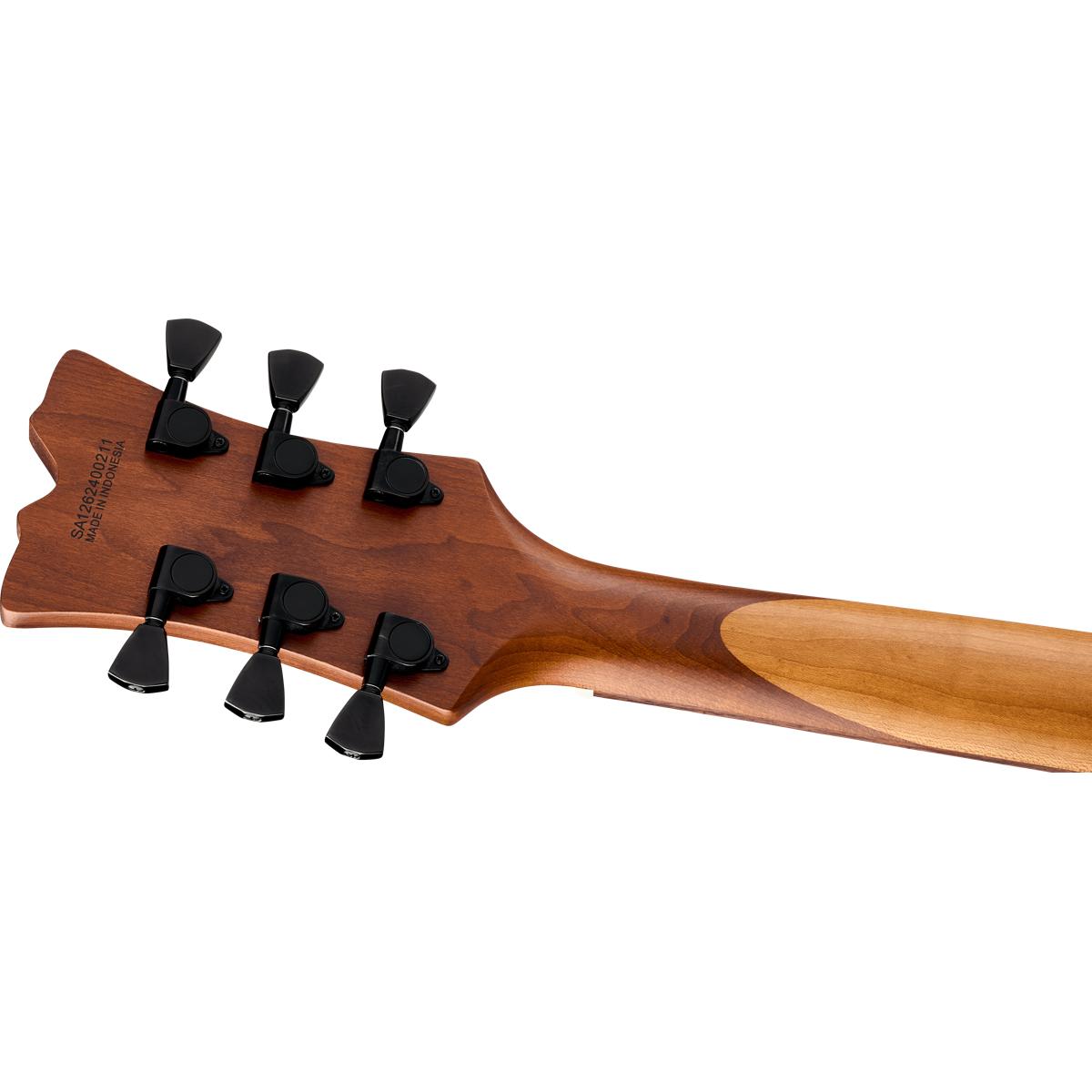 The all-new SA-126 Standard features a Mahogany body that is chambered, with a Mahogany Centerblock added for stability and tone. Capped with a maple top and masked off natural body binding for a classic and clean look. The neck is a 22 fret 12”-16” compound Rosewood fingerboard with jumbo frets and re-imagined block inlays on a graphite reinforced baked maple neck. With a scale length of 24 and three quarters… this feels like a modern - classic that is familiar and comfortable. Finally, a spoke wheel truss rod adjustment at the butt end of the neck for easy adjustments, on the fly.