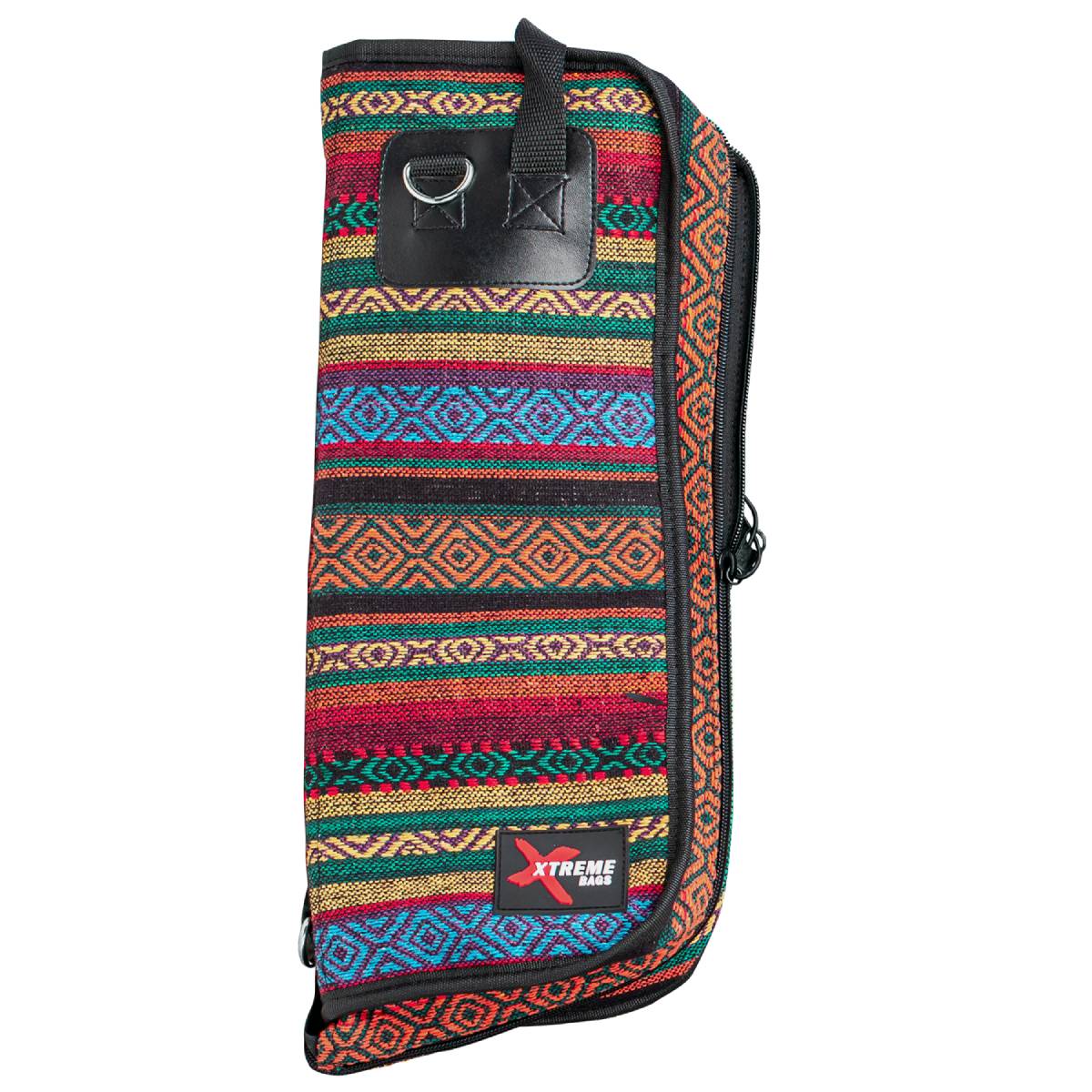 Designed for drummers who want both style and function, this drum stick bag features a vibrant multicoloured weave pattern fabric and a reinforced interior lining. It includes 10mm foam padding for superior protection, two internal accessory pockets for storing essentials, and two adjustable hanging straps with metal hooks for easy mounting on drums. A loop carry handle and removable shoulder strap provide convenient transport options, while a rubber Xtreme logo badge adds a bold finishing touch.